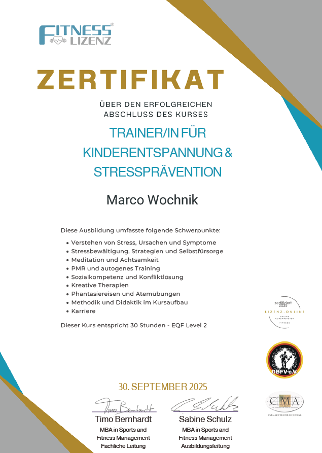 2025 Im September beendete ich die Onlineausbildung zum zertifizierten Trainer für Kinderentspannung & Stressprävention und erhielt mein Zertifikat. Ein weiterer zertifizierter Kurs als „Spieltherapie-Praktiker“ befindet sich aktuell noch in Arbeit.